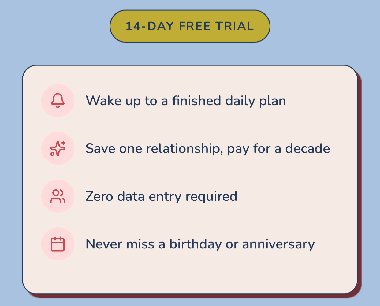 Stop scrolling through thousands of contacts. Start your day with a curated shortlist of the 3 people who need you most. Connect, check them off, and win your day before breakfast.